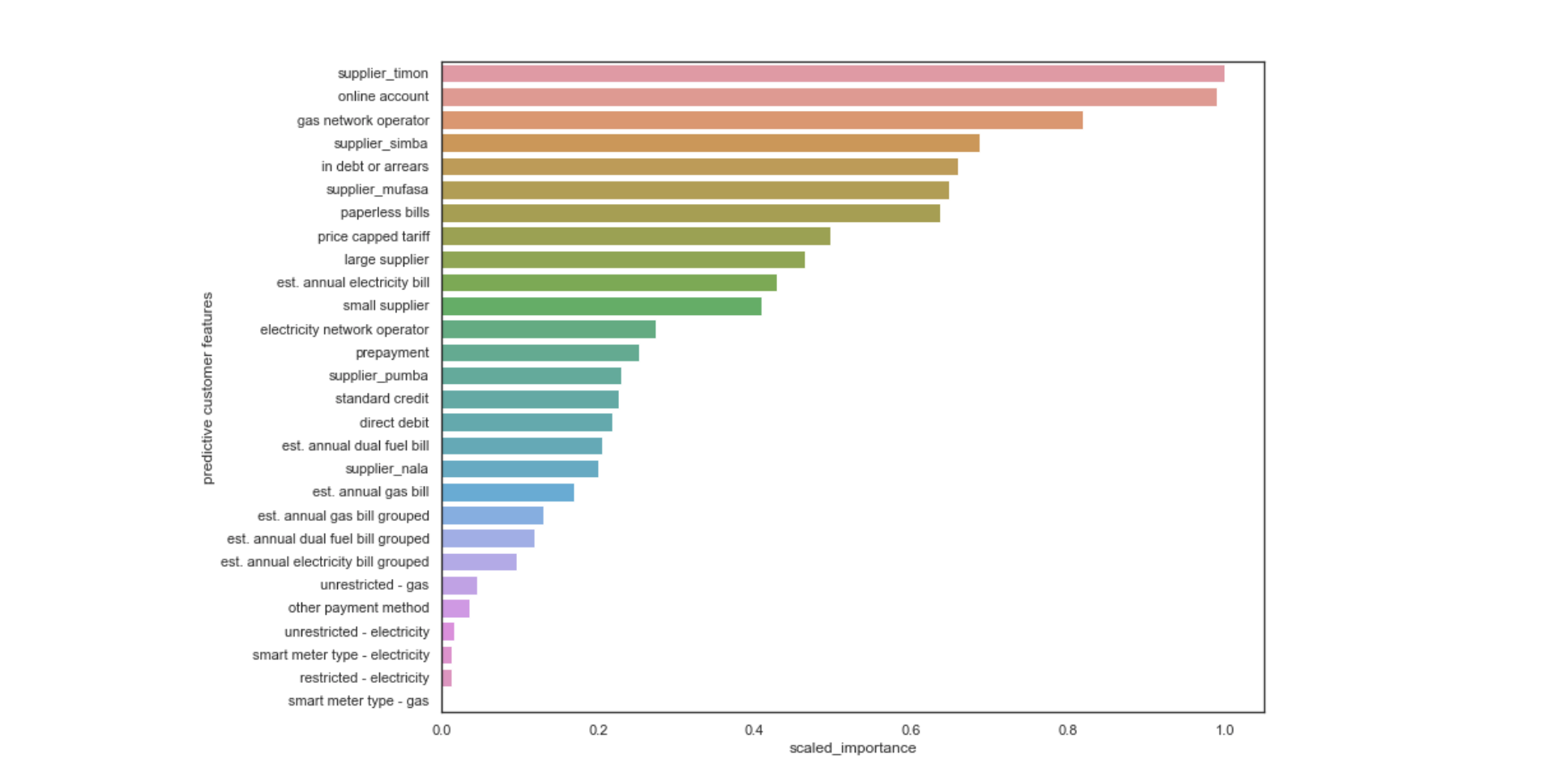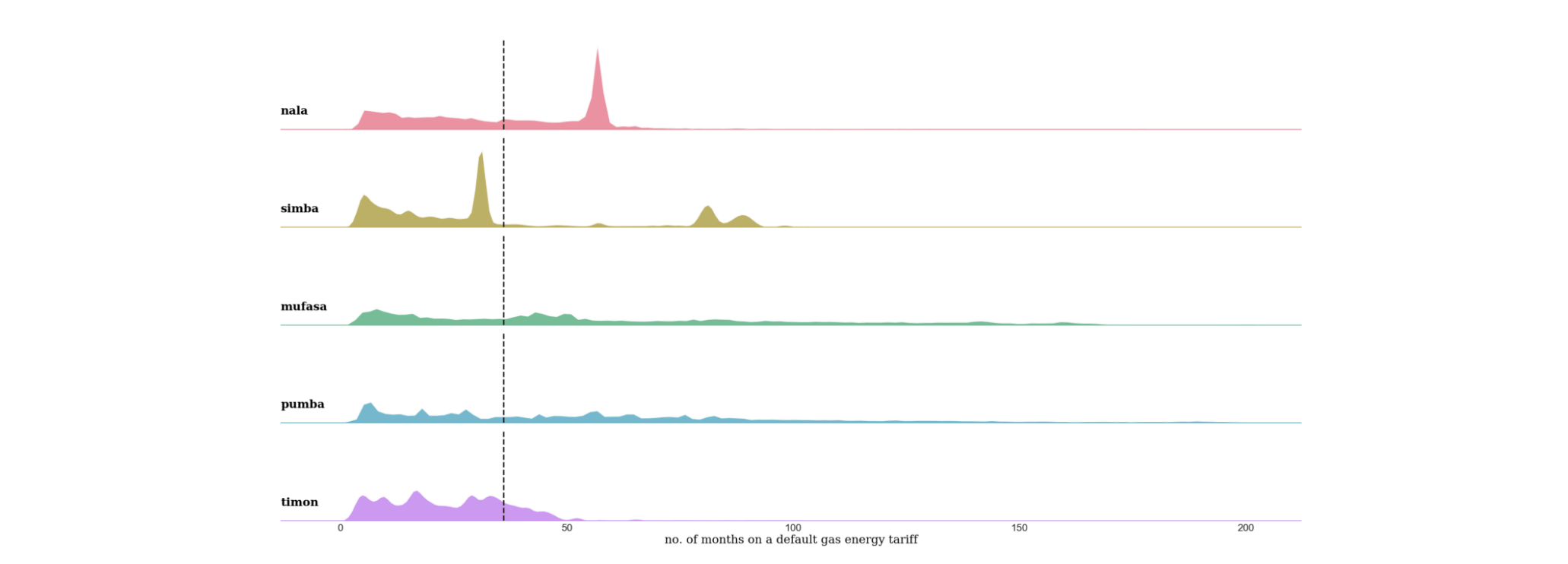 The dataset contained over 600,000 customers on default energy tariffs from five suppliers which were anonymised to Nala, Mufasa, Timon, Pumba, Simba. The dataset also contained a number of attributes relating to customers’ payment and consumption behaviour.